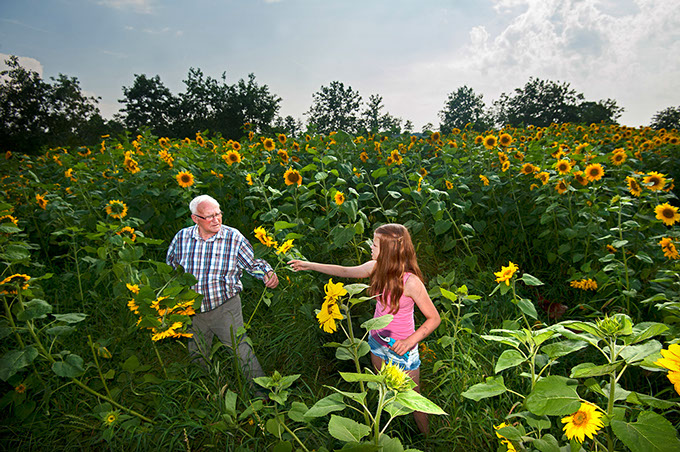 In het voorjaar legde hij op een braakliggend terrein een maïsveld aan. Daar pikken de knippen nu de zonnebloempitjes én zoeken ze schaduw.